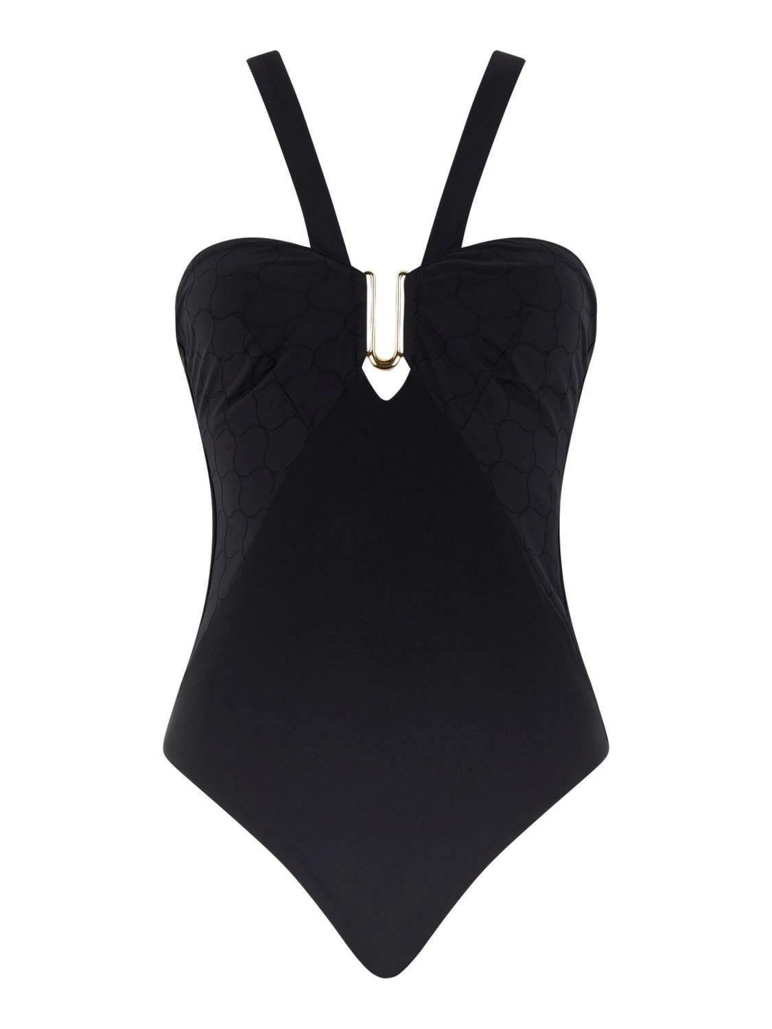 Badeanzug ohne Bügel von Chantelle der einen geraden, nahtlosen Ausschnitt hat und in der Mitte ein goldenes Schmuckstück besitzt.