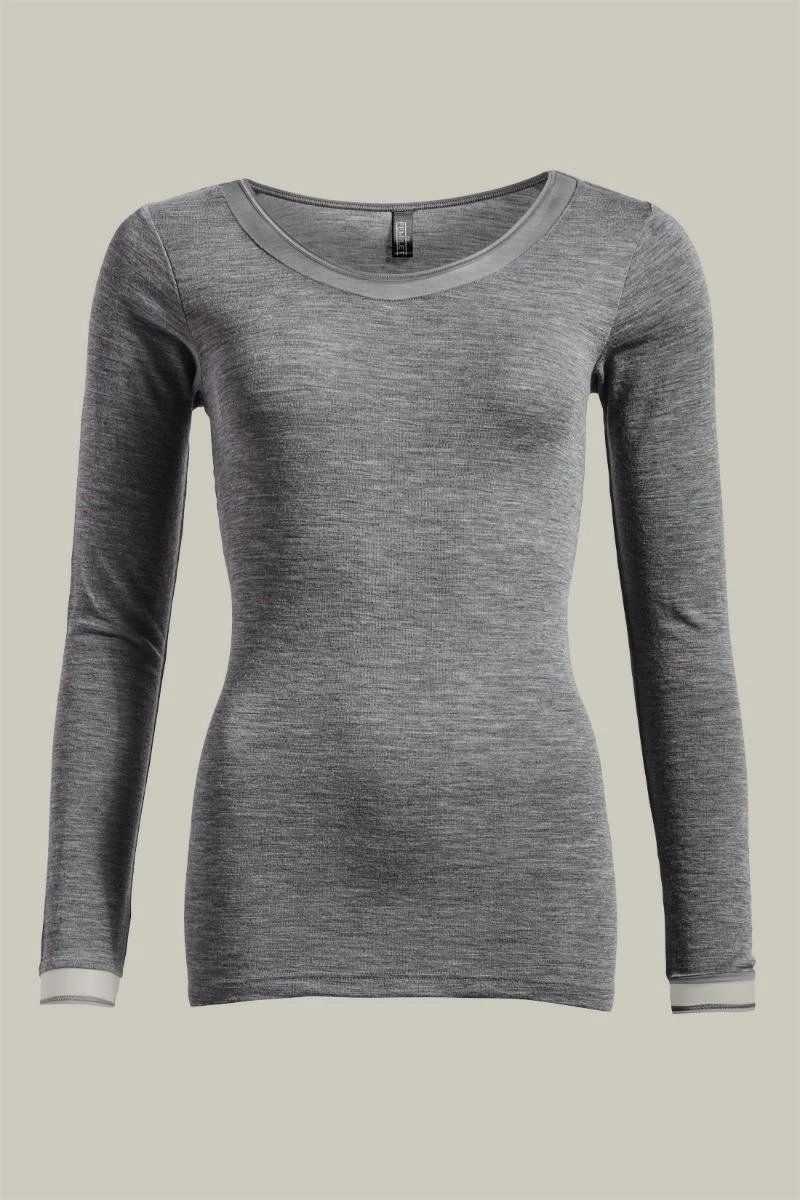 Langarm Shirt von Femilet aus antibaterieller und isolierender Merinowolle mit Tülldetails am Ausschnitt. Durch das Verwenden von Merinowolle kühlt das Shirt im Sommer und wärmt im Winter.
