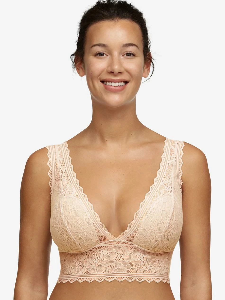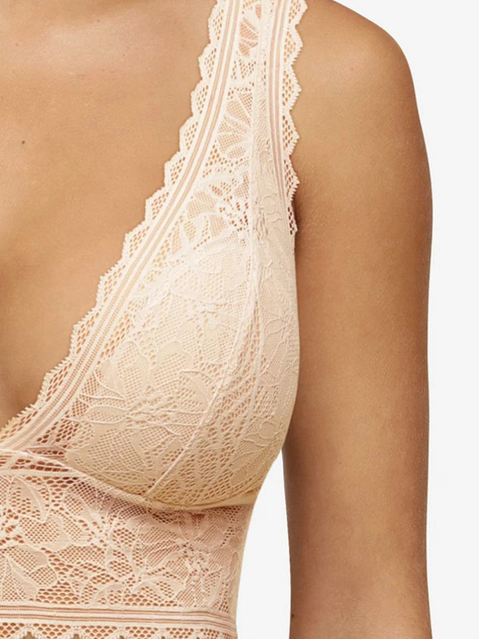 Bügelloser T-Shirt BH von Femilet in Bralette Form aus Spitze gearbeitet mit einem breiten Spitzenband unter der Büste. Der BH mit tiefem Ausschnitt vorne und ein V-Ausschnitt hinten besteht bis zu 48% aus