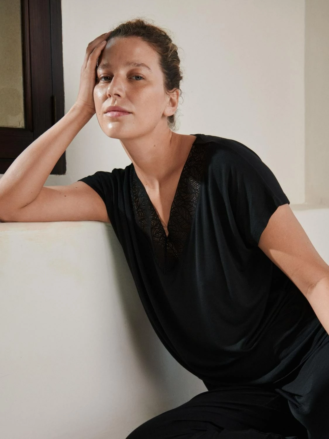 T-Shirt von Femilet mit Spitzendetails am Dekolleté.