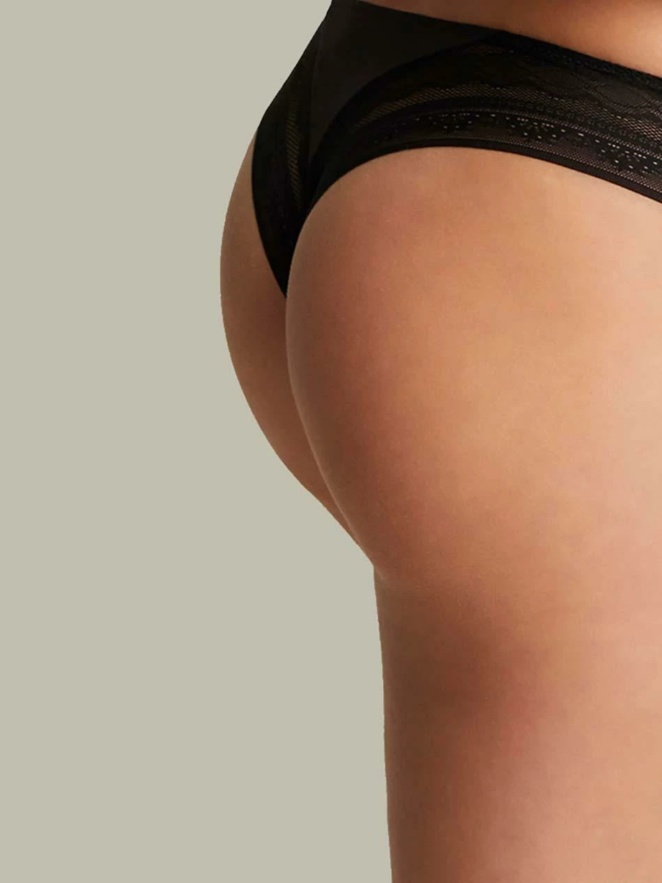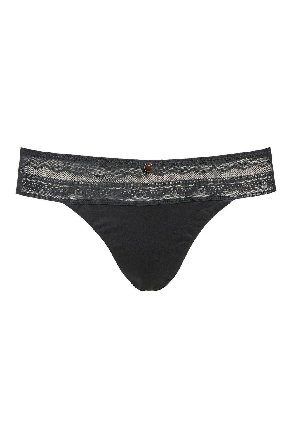 Der Tanga von Femilet verbindet ein blickdichtes Material mit Spitzendetails und einem Schmuckelement vorne.